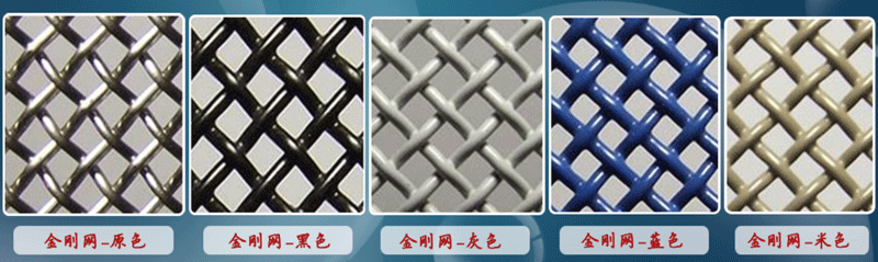 金刚网的常见颜色有原色,黑色,深灰色,浅灰色,蓝色,米色,白色等,特殊颜色可加工定制
